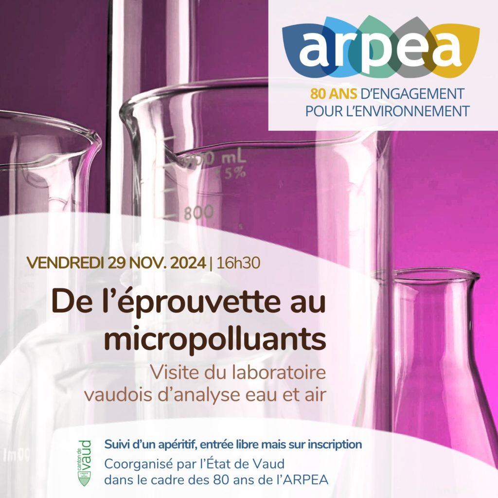Le 29 novembre, l’État de Vaud et l’ARPEA vous invitent à découvrir le laboratoire du Canton de Vaud dédié à l’analyse et à la surveillance de la qualité des eaux et de l’air. Lors de cet événement, vous visiterez les laboratoires et découvrirez les différents moyens de mesure de la Direction générale de l’environnement (VD) pour l’analyse des micropolluants dans l’eau et pour la surveillance de la qualité de l’air. Vous découvrirez ainsi comment s’articule le programme de surveillance entre le prélèvement sur le terrain et l’analyse en laboratoire.