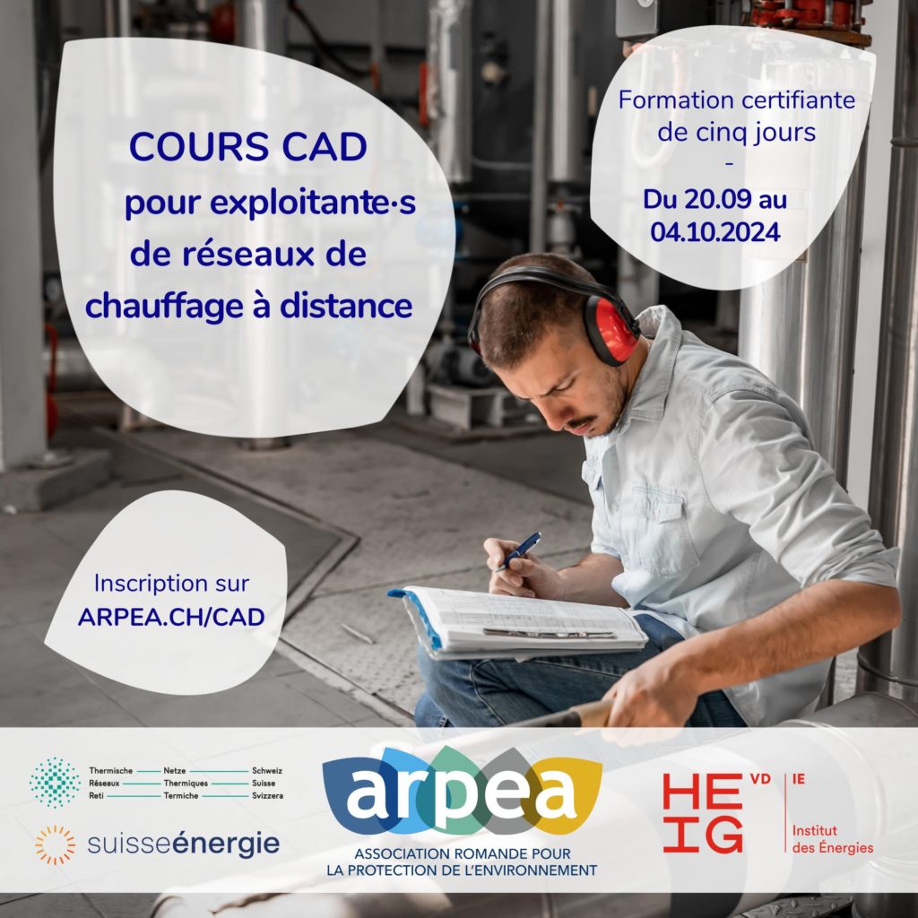 Afin de répondre au besoin de formation dans ce domaine, l’ARPEA organise chaque année un cours CAD de 5 jours spécifiquement destiné aux exploitant·e·s de réseaux de chauffage à distance.